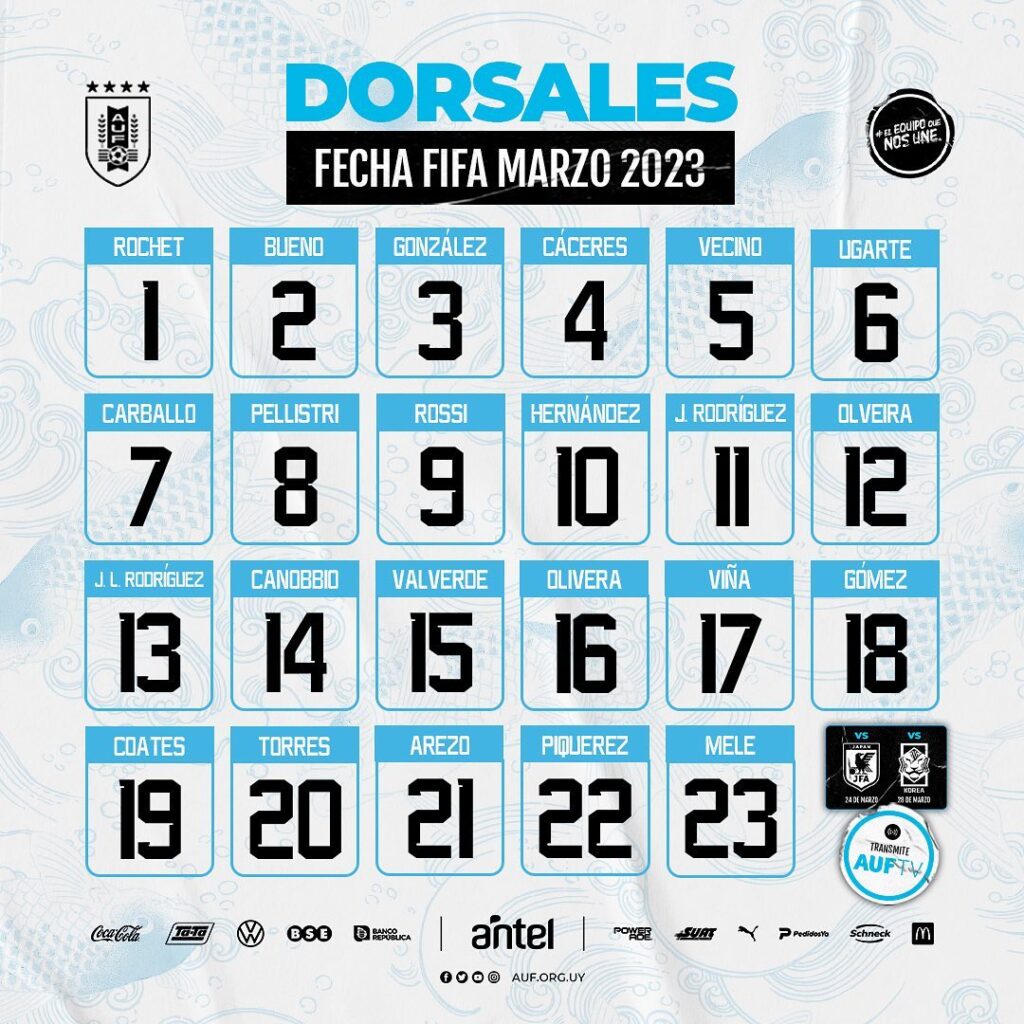 La Asociación Uruguaya de Fútbol comunicó en la noche de este miércoles qué número de camiseta le corresponderá a cada uno de los 23 futbolistas convocados. Los dorsales van del 1 al 23 y están repartidos de la siguiente manera: